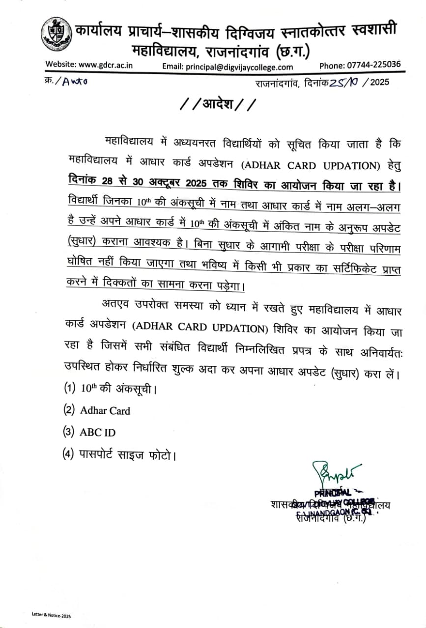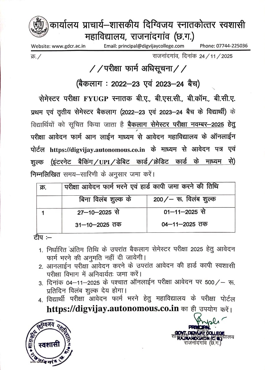 Govt. Digvijay Autonomous PG College was founded on 13th July, 1957 as a private college established by Rajnandgaon Education Society donated by revered prince Mahant Raja Digvijay Das ji. The college was taken over by the state government on 27th August 1973 and has completed SIXTY years of its glorious existence in the year 2017. In 2007, we celebrated ‘Golden Jubilee Year’ and last year 2018, we have celebrated the ‘Diamond Jubilee Year’ of our institution.The growth of the institution has been remarkable. The college which started with 73 students encompasses more than 5000 students today. The College stands like a colossus, proud of thousands of alumni that adorn positions of prominence in different walks of life, thanks to the education that they received in their alma mater. The college was conferred the autonomous status by UGC in 1992-93.Our institute, which has a historical legacy and prosperous heritage, is striving hard today to adapt the new advanced technological methods of teaching-learning to compete with the global needs of present scenario. The courses, as per the need of today’s competitive IT world, have been started in the college and are running successfully. The institution got CPE (College with Potential for Excellence) status by the UGC. Commerce department of our institution was declared the Centre of Excellence in the year 2005-2006 by the state government.The Pride of our college is that three national/international level literary personalities; Gajanand Madhav Muktibodh, Dr. Padumlal Punnalal Bakshi and Dr. Baldeo Prasad Mishra; have given their contributions as faculty members in the growth of this institution.