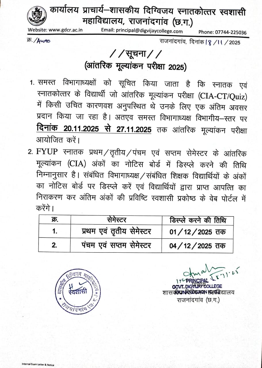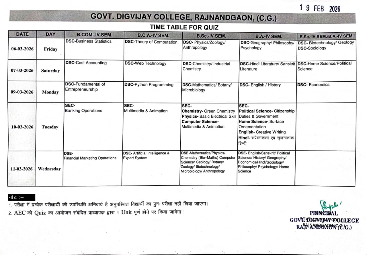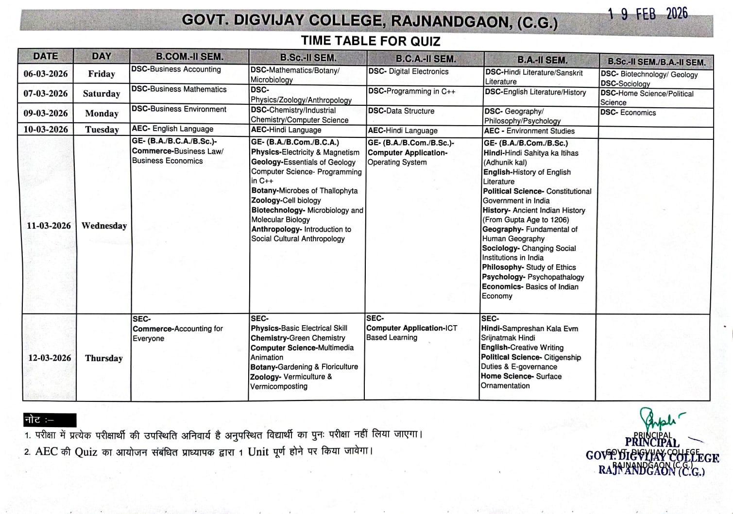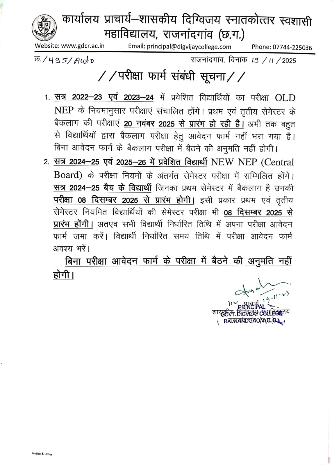 Government Digvijay Autonomous College,Rajnandgaon, a trailblazer of excellence in academics, sports, and holisticdevelopment, with its rich legacy of national and international sportsachievers, and a vibrant culture of learning, continues to illuminate theeducational landscape of Chhattisgarh. Its unwavering commitment to knowledge,discipline, and character-building makes it not just an academic Institution,but a Centre of inspiration shaping the leaders of tomorrow.