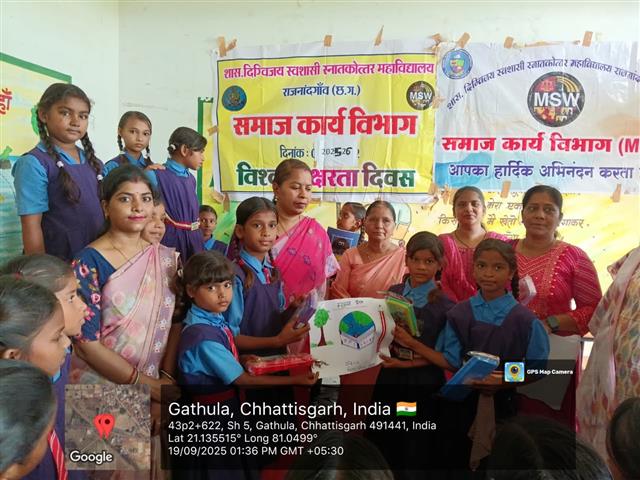 शासकीय दिग्विजय स्वशासी स्नातकोत्तर महाविद्यालय, राजनांदगांव के समाज कार्य विभाग के द्वारा " साक्षरता दिवस एवं वृक्षारोपण कार्यक्रम" का आयोजन किया गया l उक्त कार्यक्रम प्राचार्य श्रीमती डॉ.सुचित्रा गुप्ता के निर्देशन में तथा समाज कार्य विभागाध्यक्ष श्रीमती ललिता साहू के मार्गदर्शन में किया गया । उक्त कार्यक्रम शासकीय प्राथमिक शाला गठुला जिला राजनांदगांव में किया गया। इस कार्यक्रम के अंतर्गत समाज कार्य विभाग के विद्यार्थियों एवं स्कूल के विद्यार्थियों द्वारा सामूहिक रूप से रैली निकाली गई। जिसमे साक्षरता दिवस संबंधित विभिन्न नारे एवं स्लोगन लगाए गए। कार्यक्रम में सभी अतिथियों का पुष्प गुच्छ से स्वागत किया गया ।शाला के प्रधान पाठक श्रीमती सुषमा ठाकुर ने साक्षरता दिवस के उपलक्षय में कहा कि " इस परिवर्तन के दौर पर हमें अनेकों नई-नई टेक्नोलॉजी व विभिन्न प्रकार के कठिनाइयों का सामना करना पड़ता है , जिन कठिनाइयों का हम साक्षर होकर ही समझ सकते हैं तथा सही गलत का पहचान कर सकते हैं " यह कह कर बच्चों को जानकारी प्रदान की गई । समाज कार्य विभागाध्यक्ष श्रीमती ललिता साहू ने अपने उद्बोधन में कहा कि " आज के इस युग में कोई भी बच्चा निरीक्षर या अशिक्षित ना हो रहे इस हेतु सरकार ने निशुल्क शिक्षा एवं अनिवार्य शिक्षा का प्रावधान किया है एवं शिक्षा संबंधी विभिन्न महत्व कांक्षी योजनाएं लागू की है ,जिससे शत प्रतिशत बच्चे शिक्षा प्राप्त कर सकें । " तत्पश्चात शाला परिसर में साक्षरता दिवस के विषय पर पोस्टर मेकिंग एवं भाषण प्रतियोगिता का आयोजन किया गया, जिसमें पोस्टर प्रतियोगिता में में प्रथम ,द्वितीय एवं तृतीय आए विद्यार्थियों को पुरस्कृत किया गया। प्रथम स्थान कुमारी हर्षित एवं द्वितीय स्थान मोनिका साहू एवं तृतीय तेजस्वी को पुरस्कार दिया गया। उक्त कार्यक्रम में शाला परिसर में वृक्षारोपण का कार्यक्रम किया गया। एवं विद्यार्थियों को पर्यावरण संरक्षण हेतु प्रेरित किया गया । कार्यक्रम के अंत में आभार व्यक्त श्रीमती शालिनी सोनी द्वारा किया गया ।कार्यक्रम में स्कूल के प्रधान पाठक श्रीमती सुषमा ठाकुर, श्रीमती नीलिमा चंद्रिकापुरे सहायक शिक्षक एवं समाज कार्य विभाग के स्ववित्तीय प्राध्यापक सुश्री तारिणी साहू, श्रीमती शालिनी सोनी एवं समाज कार्य विभाग के सभी विद्यार्थी उपस्थित रहे l