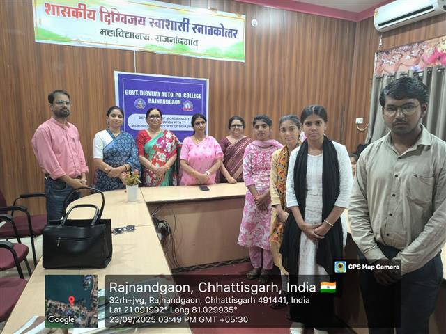 आज दिनांक 23.09.2025 को शासकीय दिग्विजय महाविद्यालय राजनांदगांव के माइक्रोबायोलॉजी विभाग एवं एम बी एस आई के संयुक्त तत्वाधान द्वारा अंतरराष्ट्रीय सूक्ष्मजीव दिवस (International Microorganisms day) का आयोजन किया गया। उक्त कार्यक्रम प्राचार्य डॉ. सुचित्रा गुप्ता के निर्देशन में तथा माइक्रोबायोलॉजी विभाग की विभागाध्यक्ष श्रीमती सविता चंद्रवंशी मार्गदर्शन में किया गया। इस दिवस के उपलक्ष्य में रंगोली प्रतियोगिता का आयोजन किया गया साथ ही एम.बी.इस.आई छात्र परिषद का गठन किया गया। कार्यक्रम की शुरुवात एम. बी.एस.आई की कोर्स कॉर्डिनेटर डॉ सोनल मिश्रा के उद्बोधन से किया गया। जिसमें मैडम ने माइक्रोबायोलॉजी सोसायटी ऑफ इंडिया के बारे में विद्यार्थियों को विस्तार से बताया । साथ ही महाविद्यालय की प्राचार्य डॉ सुचित्रा गुप्ता जी ने अपने उद्बोधन द्वारा विद्यार्थियों का ज्ञानवर्धन किया ।रंगोली प्रतियोगिता में महाविद्यालय के विभिन्न विभाग के छात्र-छात्राओं ने भाग लिया इस प्रतियोगिता में प्रथम पुरस्कार गीतांजलि राठौर द्वितीय पुरस्कार यामिनी साहू तृतीय पुरस्कार भारतीय साहू ने प्राप्त किया । पुरस्कार वितरण प्राचार्य एवं वनस्पति विभाग की विभागाध्यक्ष डॉ. अनिता महेश्वर के द्वारा प्रदान किया गया।साथ ही माइक्रोबायोलॉजी विभाग में एम.बी. एस.आई विद्यार्थी परिषद का गठन किया गया। जिसमें निम्नलिखित छात्रों का विभिन्न पदों के लिए चयन किया गया अध्यक्ष सुषमा ,उपाध्यक्ष दीक्षांत नोनहरे, सचिव गीतांजलि राठौर एवं संयुक्त सचिव आसिफा को बनाया गया। प्राचार्य मैडम ने चयनित विद्यार्थियों का शपथ ग्रहण कराया। इस कार्यक्रम में निर्णायक के रूप में डॉ किरण लता दामले ,डॉ सोनम मिश्रा ,डॉ प्रमोद कुमार महिश एवं माइक्रोबायोलॉजी विभाग के अतिथि व्याख्याता प्रगति नोनहरे, एवं श्वेता वर्मा उपस्थित थे। कार्यक्रम का संचालन प्रगति नोनहरे एवं धन्यवाद ज्ञापन विभागाध्यक्ष श्रीमति सविता चंद्रवंशी द्वारा दिया गया।