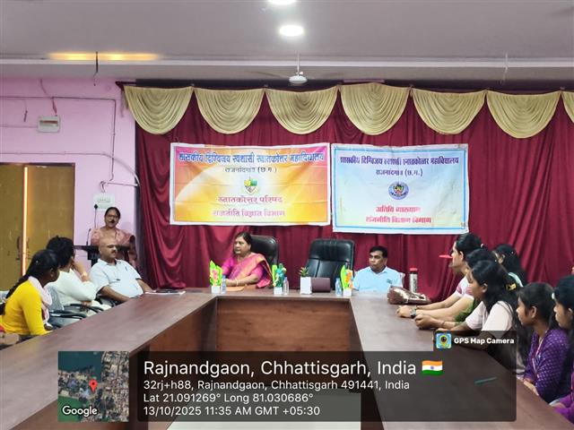 शासकीय दिग्विजय महाविद्यालय राजनांदगांव में प्राचार्य डॉ. सुचित्रा गुप्ता के निर्देशन एवं राजनीति विज्ञान विभाग की विभागाध्यक्षा डॉ. अमिता बक्शी के मार्गदर्शन में अतिथि व्याख्यान एवं राजनीति विज्ञान परिषद का उद्घाटन किया गया। विषय विशेषज्ञ के रूप में उपस्थित डॉ. अंजना ठाकुर, प्राचार्य,शासकीय नवीन महाविद्यालय, अर्जुनी जिला राजनांदगांव ने भारत में संसदीय शासन प्रणाली विषय पर व्याख्यान दिया तथा उन्होंने बताया कि संसदीय शासन प्रणाली वह प्रणाली है जिसमें कार्यपालिका अपनी नीतियों और कार्यों के लिए विधायिका के प्रति उत्तरदायी होती है। भारत का संविधान केंद्र और राज्य दोनों में संसदीय शासन प्रणाली का प्रावधान करता है। भारत में संसदीय शासन प्रणाली की व्यवस्था का विचार ब्रिटेन से लिया गया था। यह एक ऐसी शासन प्रणाली है राष्ट्रपति राज्य का प्रतिनिधित्व करता है, उक्त अवसर पर राजनीति विज्ञान स्नातकोत्तर परिषद का गठन भी किया गया। राजनीति विज्ञान विभाग की विभागाध्यक्ष डॉ. अमिता बक्शी द्वारा गुणानुक्रम के आधार पर विभिन्न पदों पर मनोनित मेधावी छात्रों के नाम की घोषणा की गई जो इस प्रकार हैं एम.ए. तृतीय सेमेस्टर की छात्रा कु. टिकेश्वरी देवांगन को अध्यक्ष,एम. ए. प्रथम सेमेस्टर की छात्रा कु. दिव्या साहू को उपाध्यक्ष, सहसचिव कु. परमिला, कोषाध्यक्ष शुभम प्रजापति, आयोजन प्रभारी मे शारदा यादव,आयुषी पांडे,कृतिका भारती,मेनिका कोठारी, प्रचार प्रसार प्रभारी में विवेक वर्मा, रागिनी बोगा,तृषा, रेशमा यादव शामिल हैं। नवीन पदाधिकारियों को बधाई देते हुए विभाग के सहायक प्राध्यापक श्री संजय सप्तर्षि ने कहा कि विभाग के आयोजनों में पदाधिकारियों से सहयोग की अपेक्षा रहेगी। विभाग के श्री दीपक कुमार द्वारा पदाधिकारियों को शुभकामनाएं देते हुए कहा गया कि प्रत्येक पदाधिकारी विभाग के लिए अत्यंक महत्वपूर्ण हैं, कार्यक्रम का संचालन डॉ. भारती सोनी के द्वारा किया गया, कार्यक्रम के समापन में विभाग के वरिष्ठ प्राध्यापक डॉ. आर. के. बंजारे द्वारा अतिथि व्याख्यान हेतु विषय विशेषज्ञ के रूप में उपस्थित डॉ. अंजना ठाकुर को धन्यवाद ज्ञापित करते हुए कहा गया कि उन्होंने बहुत ही व्यस्त दिनचर्या में भी हमें प्राथमिकता दी तथा वे व्याख्यान हेतु उपस्थित हुईं, राजनीति विज्ञान विभाग इसके लिए हृदय से उनका आभारी है।