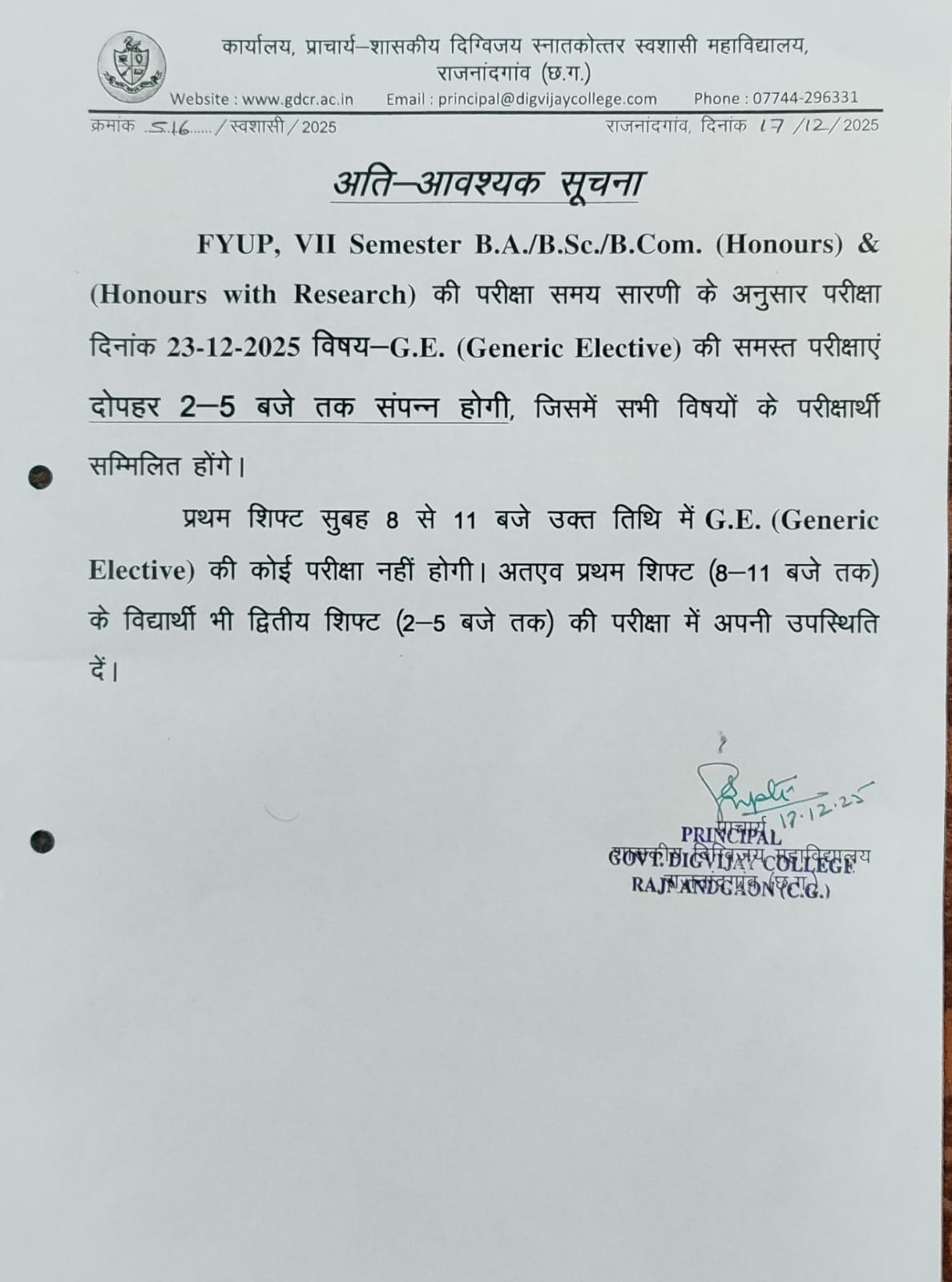 Government Digvijay Autonomous College,Rajnandgaon, a trailblazer of excellence in academics, sports, and holisticdevelopment, with its rich legacy of national and international sportsachievers, and a vibrant culture of learning, continues to illuminate theeducational landscape of Chhattisgarh. Its unwavering commitment to knowledge,discipline, and character-building makes it not just an academic Institution,but a Centre of inspiration shaping the leaders of tomorrow.