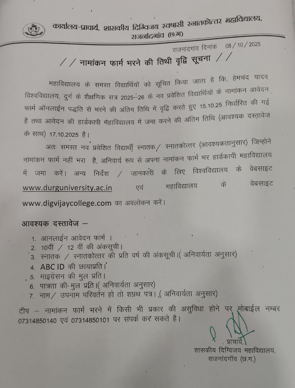 Govt. Digvijay Autonomous PG College was founded on 13th July, 1957 as a private college established by Rajnandgaon Education Society donated by revered prince Mahant Raja Digvijay Das ji. The college was taken over by the state government on 27th August 1973 and has completed SIXTY years of its glorious existence in the year 2017. In 2007, we celebrated ‘Golden Jubilee Year’ and last year 2018, we have celebrated the ‘Diamond Jubilee Year’ of our institution.The growth of the institution has been remarkable. The college which started with 73 students encompasses more than 5000 students today. The College stands like a colossus, proud of thousands of alumni that adorn positions of prominence in different walks of life, thanks to the education that they received in their alma mater. The college was conferred the autonomous status by UGC in 1992-93.Our institute, which has a historical legacy and prosperous heritage, is striving hard today to adapt the new advanced technological methods of teaching-learning to compete with the global needs of present scenario. The courses, as per the need of today’s competitive IT world, have been started in the college and are running successfully. The institution got CPE (College with Potential for Excellence) status by the UGC. Commerce department of our institution was declared the Centre of Excellence in the year 2005-2006 by the state government.The Pride of our college is that three national/international level literary personalities; Gajanand Madhav Muktibodh, Dr. Padumlal Punnalal Bakshi and Dr. Baldeo Prasad Mishra; have given their contributions as faculty members in the growth of this institution.