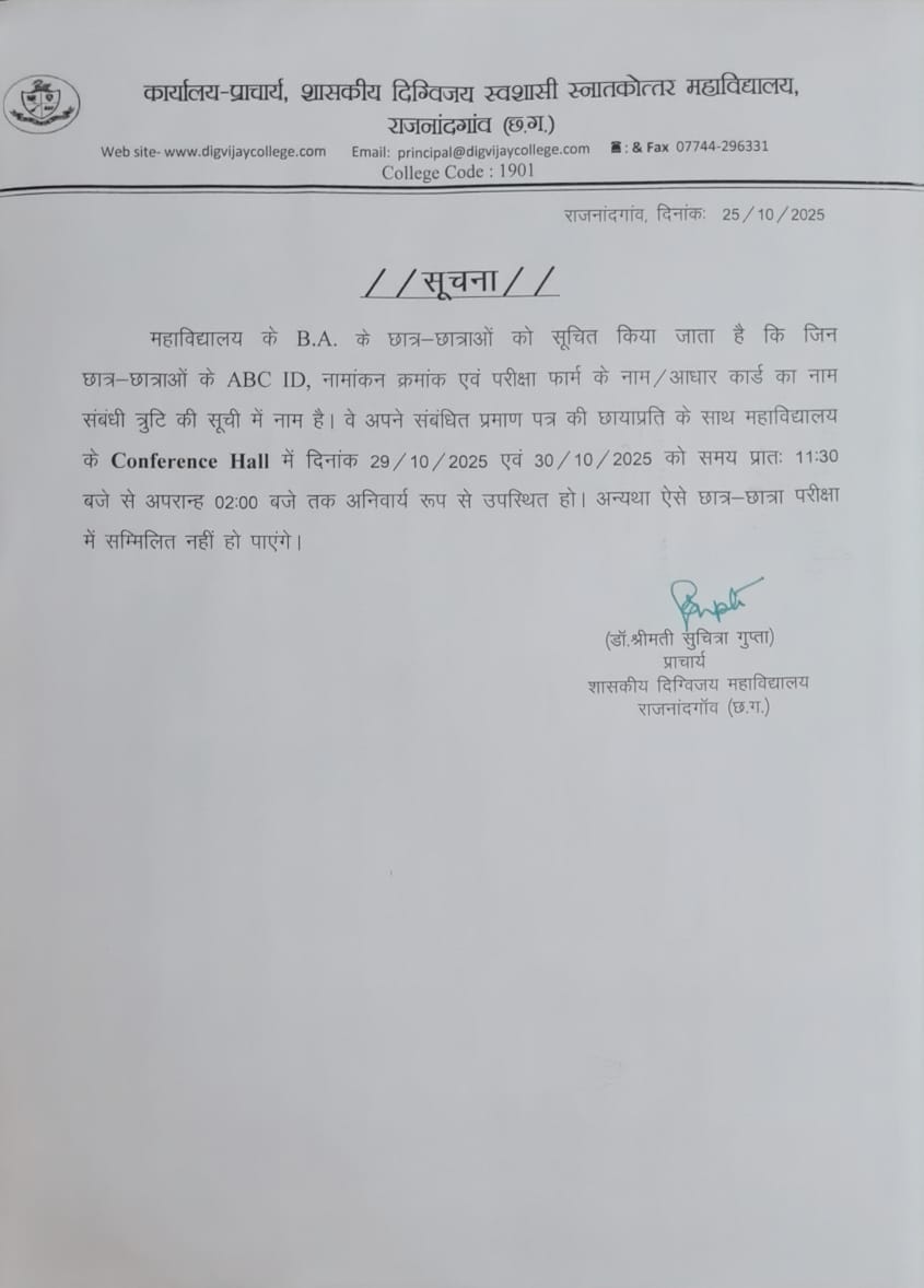 Government Digvijay Autonomous College,Rajnandgaon, a trailblazer of excellence in academics, sports, and holisticdevelopment, with its rich legacy of national and international sportsachievers, and a vibrant culture of learning, continues to illuminate theeducational landscape of Chhattisgarh. Its unwavering commitment to knowledge,discipline, and character-building makes it not just an academic Institution,but a Centre of inspiration shaping the leaders of tomorrow.