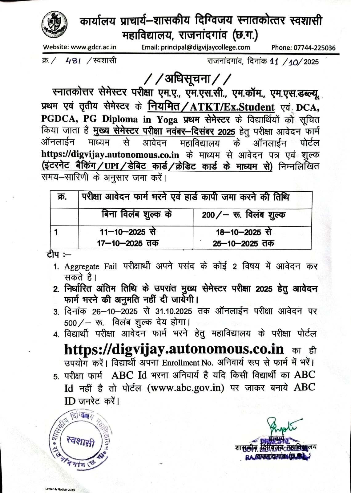 सूचना शासकीय दिग्विजय स्वशासी स्नातकोत्तर महाविद्यालय में अध्यनरत स्नातक अंतिम वर्ष एवं स्नातकोत्तर स्तर के विद्यार्थियों को सूचित किया जाता है रोजगार,मार्गदर्शन एवं प्लेसमेंट प्रकोष्ठ द्वारा दिनांक 12 फरवरी 2025 को महाविद्यालय एवं जिले के विभिन्न महाविद्यालयों के विद्यार्थियों के लिए NIIT-IFBI (Sourcing Partner of ICICI Bank ) संस्था द्वारा 200 से अधिक पदों के लिए प्लेसमेंट कैंप का आयोजन किया जा रहा है। नोट: उक्त प्लेसमेंट के लिए प्रतिभागियों को Google फॉर्म भरना अनिवार्य है। स्थान : न्यू हॉल समय : 11:00 से 02:00