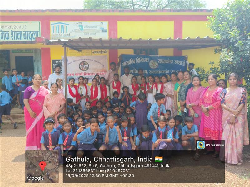 शासकीय दिग्विजय स्वशासी स्नातकोत्तर महाविद्यालय, राजनांदगांव के समाज कार्य विभाग के द्वारा " साक्षरता दिवस एवं वृक्षारोपण कार्यक्रम" का आयोजन किया गया l उक्त कार्यक्रम प्राचार्य श्रीमती डॉ.सुचित्रा गुप्ता के निर्देशन में तथा समाज कार्य विभागाध्यक्ष श्रीमती ललिता साहू के मार्गदर्शन में किया गया । उक्त कार्यक्रम शासकीय प्राथमिक शाला गठुला जिला राजनांदगांव में किया गया। इस कार्यक्रम के अंतर्गत समाज कार्य विभाग के विद्यार्थियों एवं स्कूल के विद्यार्थियों द्वारा सामूहिक रूप से रैली निकाली गई। जिसमे साक्षरता दिवस संबंधित विभिन्न नारे एवं स्लोगन लगाए गए। कार्यक्रम में सभी अतिथियों का पुष्प गुच्छ से स्वागत किया गया ।शाला के प्रधान पाठक श्रीमती सुषमा ठाकुर ने साक्षरता दिवस के उपलक्षय में कहा कि " इस परिवर्तन के दौर पर हमें अनेकों नई-नई टेक्नोलॉजी व विभिन्न प्रकार के कठिनाइयों का सामना करना पड़ता है , जिन कठिनाइयों का हम साक्षर होकर ही समझ सकते हैं तथा सही गलत का पहचान कर सकते हैं " यह कह कर बच्चों को जानकारी प्रदान की गई । समाज कार्य विभागाध्यक्ष श्रीमती ललिता साहू ने अपने उद्बोधन में कहा कि " आज के इस युग में कोई भी बच्चा निरीक्षर या अशिक्षित ना हो रहे इस हेतु सरकार ने निशुल्क शिक्षा एवं अनिवार्य शिक्षा का प्रावधान किया है एवं शिक्षा संबंधी विभिन्न महत्व कांक्षी योजनाएं लागू की है ,जिससे शत प्रतिशत बच्चे शिक्षा प्राप्त कर सकें । " तत्पश्चात शाला परिसर में साक्षरता दिवस के विषय पर पोस्टर मेकिंग एवं भाषण प्रतियोगिता का आयोजन किया गया, जिसमें पोस्टर प्रतियोगिता में में प्रथम ,द्वितीय एवं तृतीय आए विद्यार्थियों को पुरस्कृत किया गया। प्रथम स्थान कुमारी हर्षित एवं द्वितीय स्थान मोनिका साहू एवं तृतीय तेजस्वी को पुरस्कार दिया गया। उक्त कार्यक्रम में शाला परिसर में वृक्षारोपण का कार्यक्रम किया गया। एवं विद्यार्थियों को पर्यावरण संरक्षण हेतु प्रेरित किया गया । कार्यक्रम के अंत में आभार व्यक्त श्रीमती शालिनी सोनी द्वारा किया गया ।कार्यक्रम में स्कूल के प्रधान पाठक श्रीमती सुषमा ठाकुर, श्रीमती नीलिमा चंद्रिकापुरे सहायक शिक्षक एवं समाज कार्य विभाग के स्ववित्तीय प्राध्यापक सुश्री तारिणी साहू, श्रीमती शालिनी सोनी एवं समाज कार्य विभाग के सभी विद्यार्थी उपस्थित रहे l