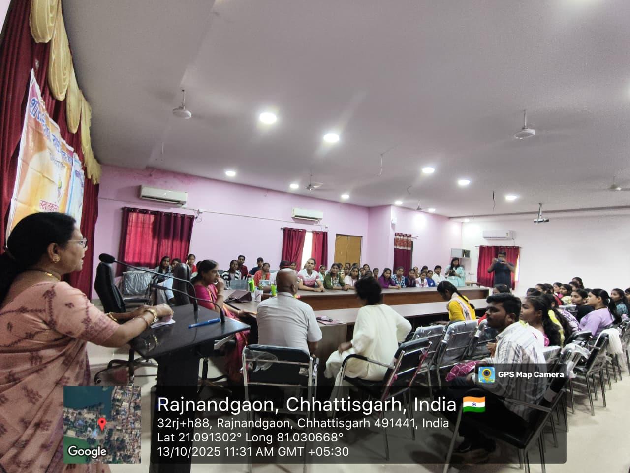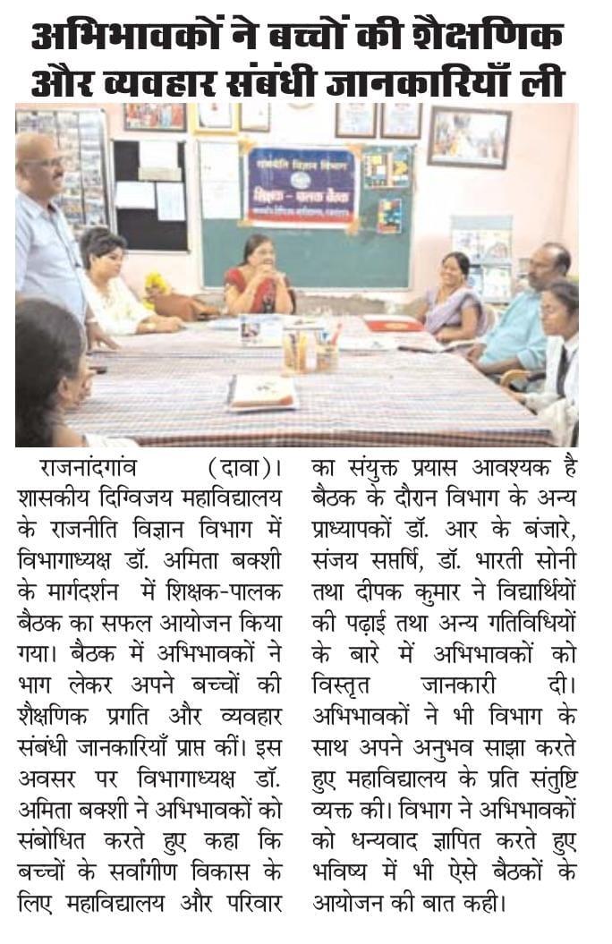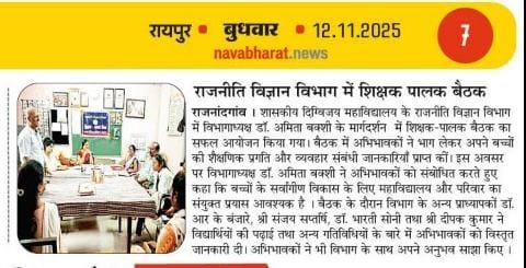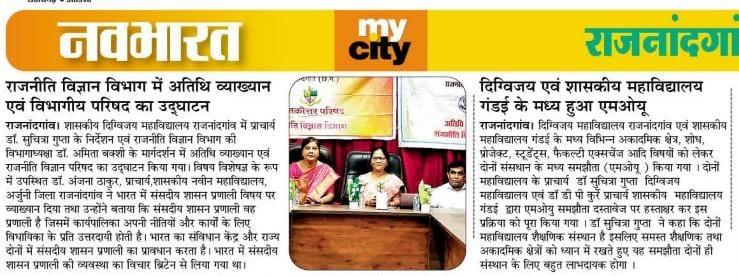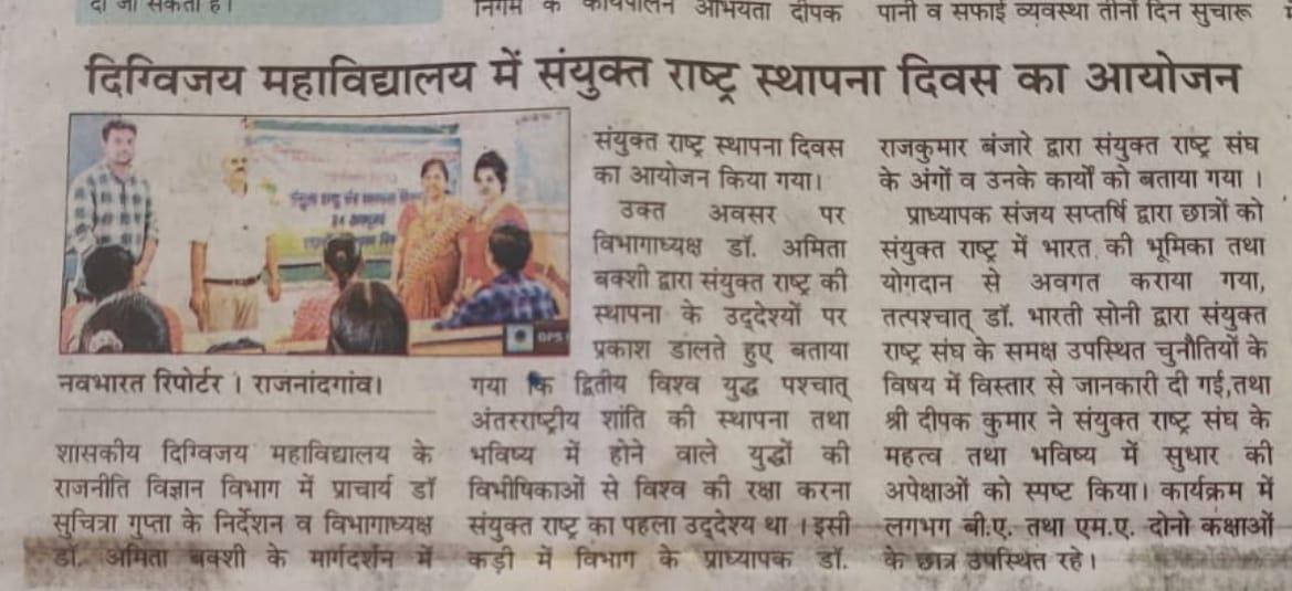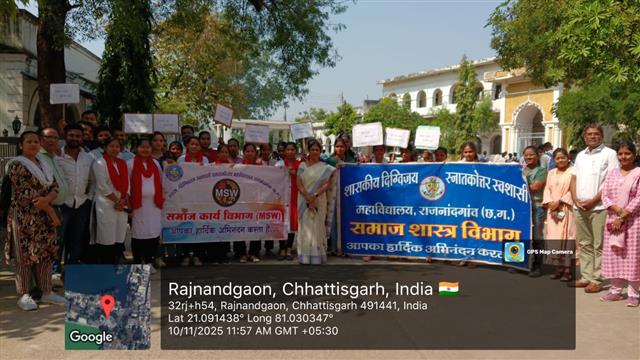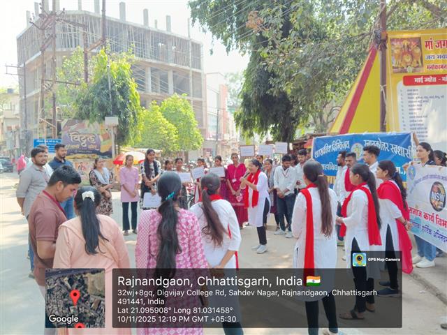 शासकीय दिग्विजय स्वशासी स्नातकोत्तर महाविद्यालय राजनांदगांव के प्राचार्य डॉ.सुचित्रा गुप्ता के निर्देशन एवं समाजकार्य विभागाध्यक्ष श्रीमती ललिता साहू के मार्गदर्शन में "यातायात सड़क सुरक्षा सप्ताह" पर समाज कार्य के विद्यार्थियों द्वारा जन जागरूकता रैली व नुक्कड़ नाटक का आयोजन महाविद्यालय परिसर से मानव मंदिर चौक तक किया गया।उक्त कार्यक्रम में डॉ.सुचित्रा गुप्ता के द्वारा अपने उद्बोधन में विद्यार्थियों को जागरूक करते हुए - यातायात सुरक्षा के नियमों एवं ट्रैफिक नियमो की जानकारी से अवगत कराया एवं अपने आस पास के लोगो को सड़क नियमो के प्रति जागरूक करने की प्रेरणा दी। साथ ही समाज कार्य विभागाध्यक्ष श्रीमती ललिता साहू द्वारा युवाओ को संबोधित करते हुए कहा कि " शराब पी कर गाड़ी न चलाये, दो से अधिक सवारी न बैठाये " उक्त रैली के अंतर्गत विद्यार्थियों द्वारा यातायात सड़क सुरक्षा सप्ताह पर जन जागरूकता हेतु विभिन्न नारे लगाए गए। मोबाइल का साथ सड़क पर घात, हेलमेट पहनो सुरक्षित रहो, सावधानी हटी दुर्घटना घटी आदि स्लोगन के माध्यम से जनता को जागरूक किया गया एवं मानव मंदिर चौक पर नुक्कड़ नाटक का आयोजन किया गया । नाटक में विभिन्न स्लोगन के माध्यम से विद्यार्थियों द्वारा आम जनता के मध्य यातायात सड़क सुरक्षा नियमों व सड़क दुर्घटनाओं से बचने का संदेश दिया गया। उक्त कार्यक्रम में समाजशास्त्र विभागाध्यक्ष डॉ ए. के. मंडावी, समाजकार्य विभागाध्यक्ष श्रीमती ललिता साहू ,श्रीमती शालिनी सोनी एवं सुश्री तारणी साहू डॉ प्रियंका लोहिया श्रीमती चित्राशा राठौर एवं समाज कार्य के सभी विद्यार्थी उपस्थित रहे।