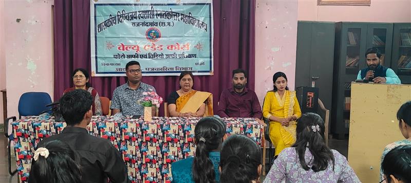 राजनांदगांव। शासकीय दिग्विजय महाविद्यालय के प्राचार्य डॉ.सुचित्रा गुप्ता के निर्देशन में पत्रकारिता एवं जनसंचार विभाग के विभागाध्यक्ष डॉ. बी. एन. जागृत के मार्गदर्शन में 30 घंटे का वैल्यू एडेड कोर्स के अंतर्गत फोटोग्राफी एवं वीडियोग्राफी प्रशिक्षण कार्यक्रम का शुभारंभ किया गया। कार्यक्रम की शुरुआत मां सरस्वती के चित्र पर माल्यार्पण एवं दीप प्रज्वलन कर तथा छत्तीसगढ़ी राजभाषा गीत से की गई।